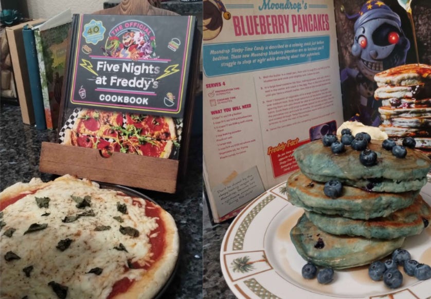 The first one we decided to check out is the official Five Night’s at Freddy’s cookbook. We cooked the Official Pizza of course as well as Moondrop’s Blueberry Pancakes and Fazbear’s Dunking Cinnamon Sticks. We also made one of the beverages, the Sodaroni. We had to switch up the easy plex pizza sauce since it was a little too thin. The recipes we followed to a tee, turned out very bland. I would recommend spicing it up. When it comes to the theme of the cookbook its really allover the place. It has both older Five Night’s at Freddy’s characters as well as the newer ones from the Pizzaplex. Its really all over the place with random recipes with characters just kinda slapped on. Such as Bellora’s Salmon Burgers or Balloon Boy’s Chicken & Chorizo Fajitas. I wish these recipes were from the actual Pizzaplex from in-game restaurants like the Faz-Pad. A lot of the food doesn’t seem like things I would find in a Kids Arcade.
